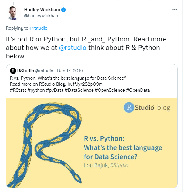 You should pay attention to what Wickham says about R. Wickham wrote ggplot2 and other significant packages for R. Wickham is the Chief Data Scientist at Posit, which is the company behind R Studio and the tidyverse. Wickham is a leader in the R community. Wickham was described as “R’s most famous developer” by Kopf (2019). Wickham is quoted in that same article as saying, “Use whatever makes you happy.”