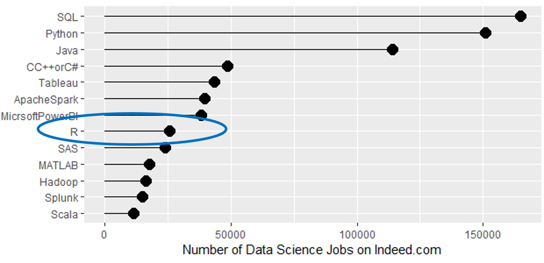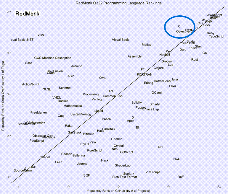 The IEEE Top Programming Langages 2022 places R in the middle of the pack for charted langauges.