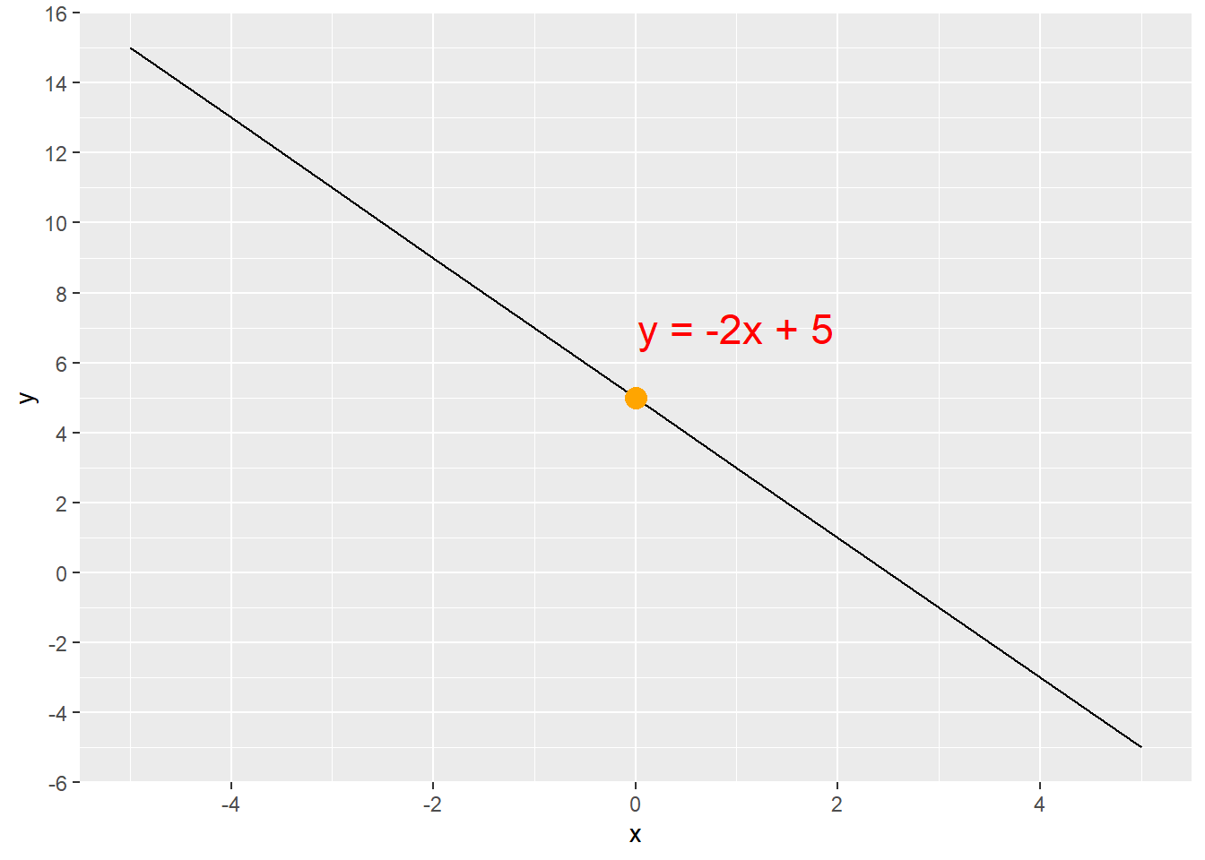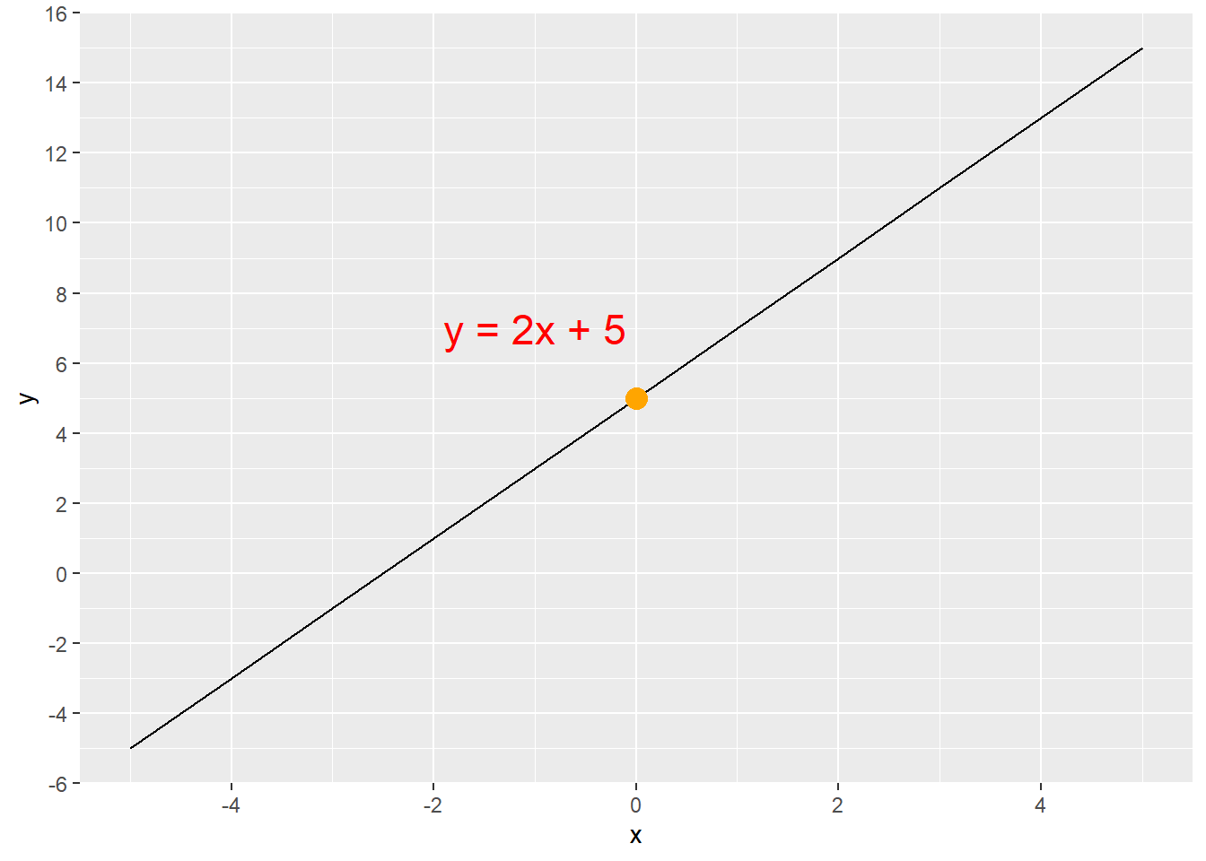 The equation y = 2x + 5 produces the line shown in Figure 5.1. The y-intercept is at (0,5), which is the orange dot. We can find any value of y for any given value of x by simply multiplying x by 2 and then adding 5. If x = 4, then y = 13, because (2 * 4) + 5 = 13. Thus, the line goes through the point (4,13). This can be confirmed in Figure 5.1.