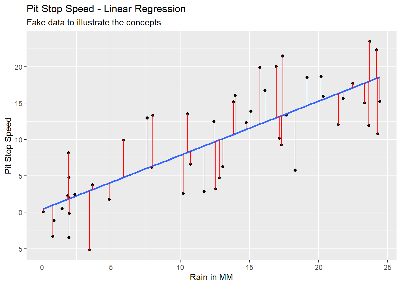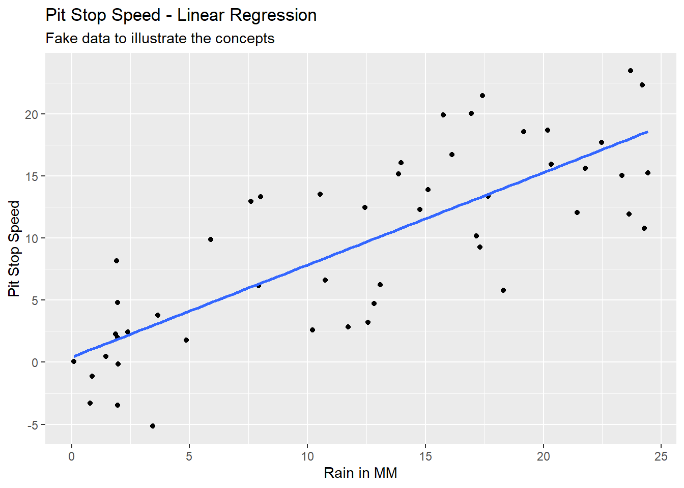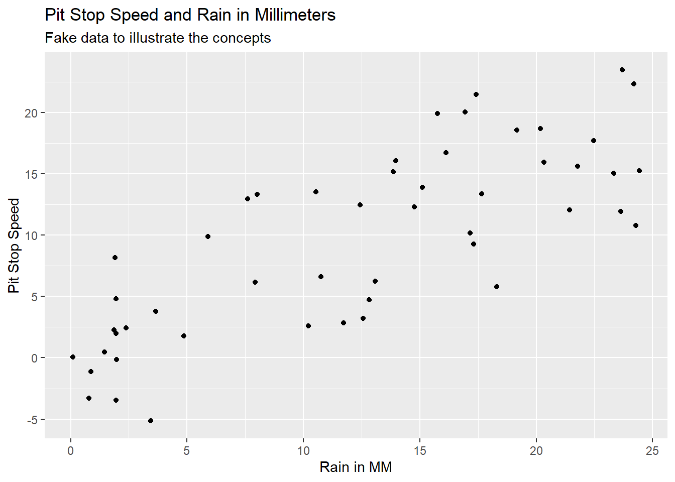 Imagine we had data on pit stop time in seconds and rain in millimeters. The data might look like Figure 5.3 with Pit Stop Speed on the y-axis and Rain in MM on the x-axis. This is fake data to illustrate the concept of linear regression.