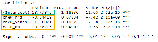 \[ps\_seconds = 13.78 - 0.54 * crew\_hrs - 1.26 * crew\_years + 0.78 * rain\_mm \tag{5.7}\]