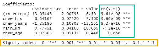 If the p-value of an individual coefficient (Figure 5.12) is below the chosen significance level then the null hypothesis can be rejected for that specific x variable. The p-value is listed as a number (green box under Pr(>|t|)) and scored with an asterisk system, which allows quick comparison to standard significant levels (yellow box). If we choose a significance level of 0.05, then the p-value for crew_age is too high. Thus we cannot reject the null hypothesis for this variable at the 0.05 significance level. Therefore, crew_age must be removed from our model to create a valid model. Always remove individual x variables one at a time starting with the x variable with the highest p-value. Remove one x varaible, then rerun the OLS. Repeat until all x variables have a p-value less than the chosen significance level.